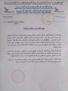 أصدرت اليوم الشركة الوطنية للنقل بالسكك الحديدية بيانا حاز موقع “سهم ميديا” على نسخة منه ، تعلم فيه كافة مستخدمي الشركة دراسة آليات تطبيق المرسوم الرئاسي رقم 21 – 137 مؤرخ في 7 أفريل 2021، والذي يحدد الأجر الوطني الأدنى المضمون بــ 20.000 دج.