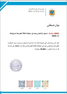 وفي بيان لسونلغاز، حاز موقع ” سهم ميديا ” على نسخة منه، أعلن عن تسجيله لرقم قياسي جديد في استهلاك الطاقة الكهربائية بتاريخ 14 أوت 2022.