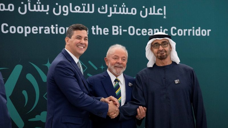 شهد رئيس دولة الإمارات، محمد بن زايد آل نهيان ورئيس البرازيل لولا دا سيلفا، ورئيس الباراغواي سانتياغو بينيا توقيع إعلان مشترك للتعاون بشأن ممر المحيطين،